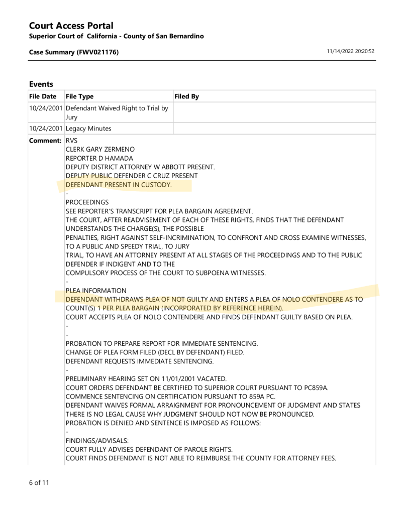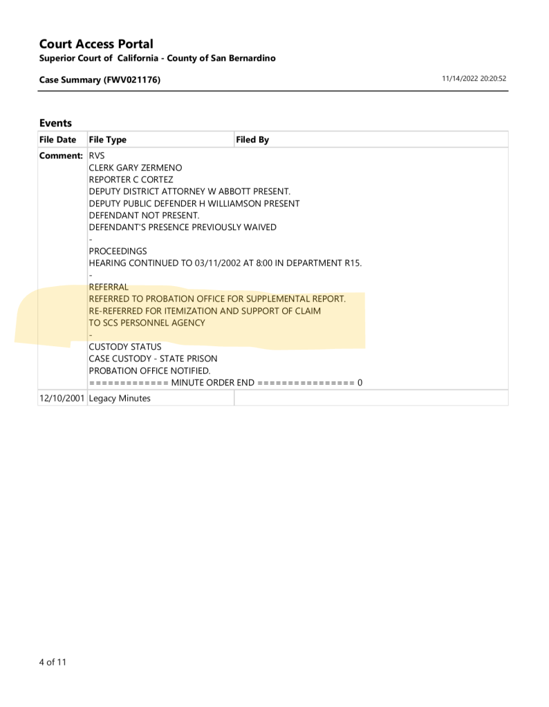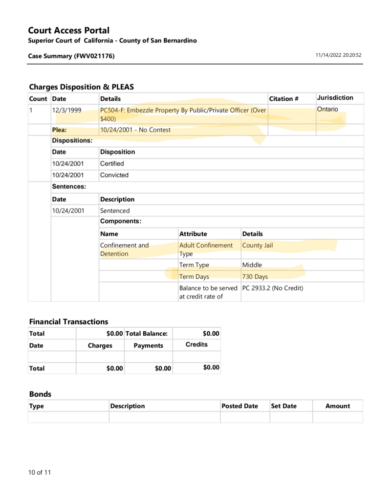 That felony, Case No. FWV021176, was committed in San Bernardino County, under Penal Code section 504-F, Embezzle Property by Public/Private Officer (Over $400). The victim was SCS Personnel. Logan was arrested on December 3, 1999; the case was filed on October 4, 2000, and Logan pled on October 24, 2001.