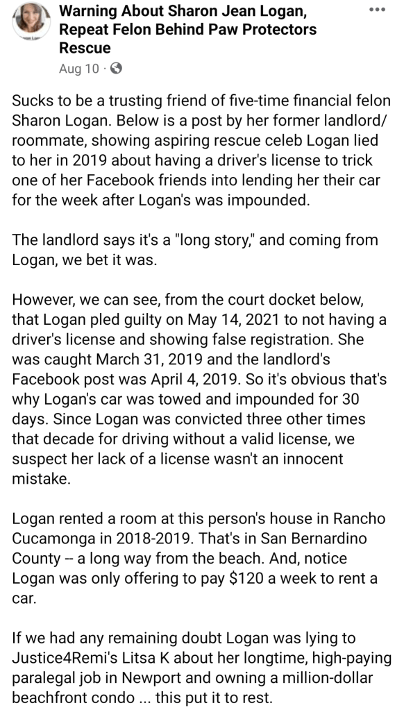 A now-deceased attorney named Brady Price accused her on the Paw Protectors Page of stealing $7,500 from him, although he didn’t prosecute. Soon afterward, Logan committed misdemeanor ID Theft against “Margaret L,” and was convicted in 2016. In 2014, she stole from two plumbing companies who employed her, and pled to her fifth and sixth financial felonies for that in 2017.