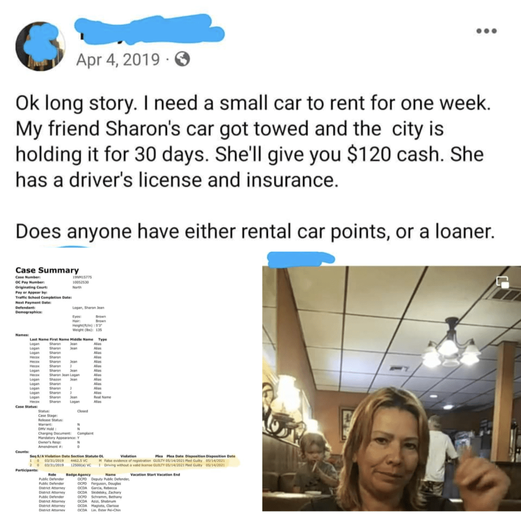 Logan appears to have avoided arrest since getting out of jail for those last thefts, except for a misdemeanor in 2019 for driving without a license and showing false registration. But in late 2021, she tricked her way into a law firm office manager job by providing a fictitious resume, and we don’t know what she’s doing for money since she lost that job in September. She’s also got an open bankruptcy case.