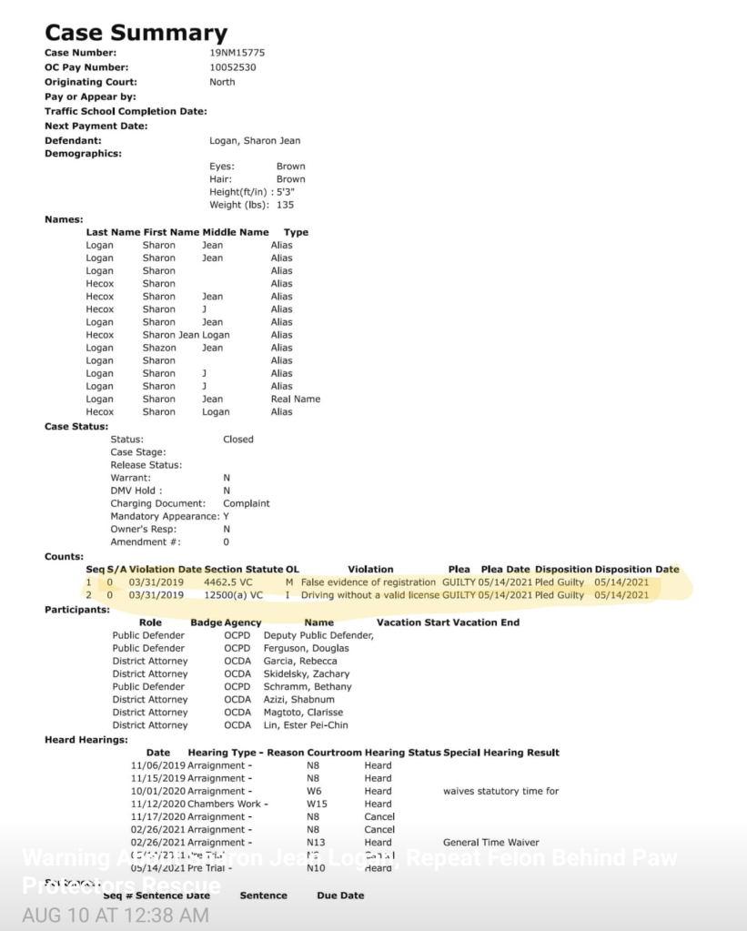 Logan moved to OC after leaving prison, and avoided financial crime convictions for several years, although her court records showed plenty of other drama with evictions, restraining orders, civil judgments, and several misdemeanors for driving without a license.