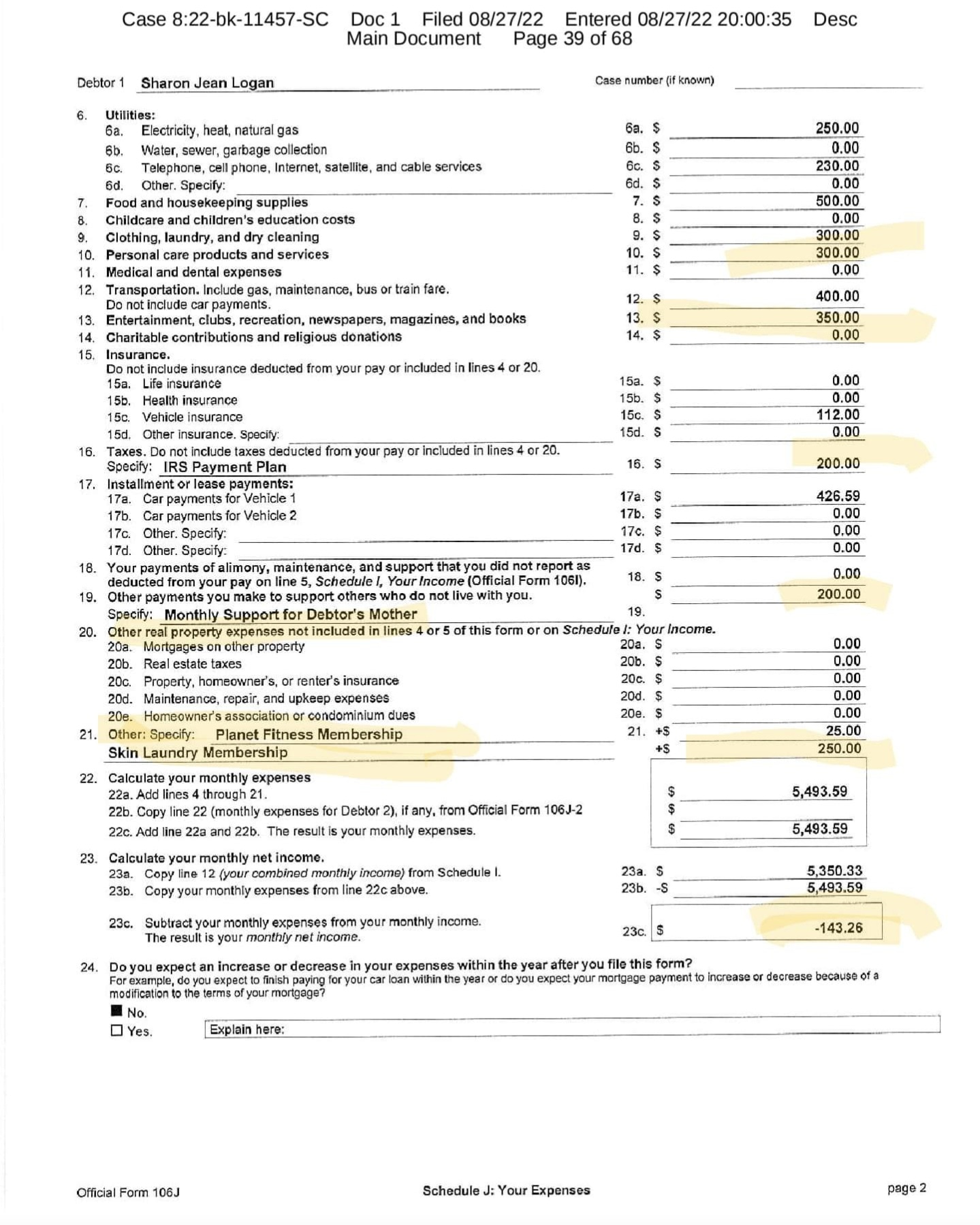 August, 2022: Logan filed for Chapter 7 bankruptcy, seeking to dump all her debts. Among her claimed ongoing necessities were $250/month for facials from Skin Laundry of Newport Beach.