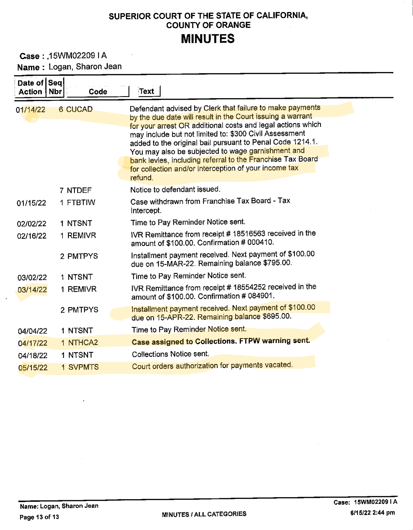 January-May, 2022: Logan failed to make timely monthly payments on her court fees from a 2014 criminal court case. In May, the court ended her payment plan and forwarded her case to Collections. (Source: Court file.)