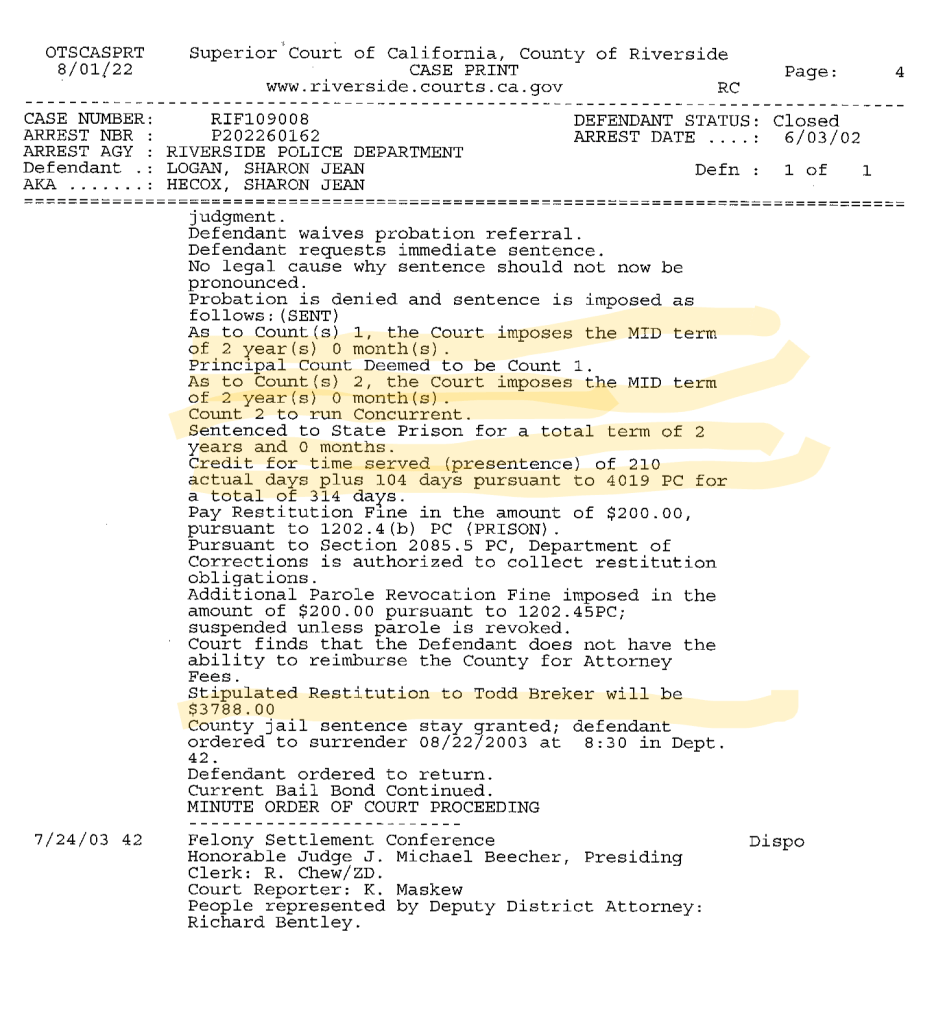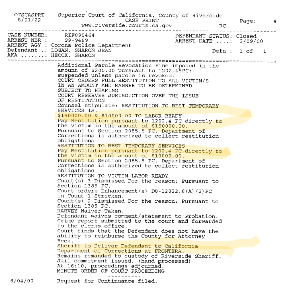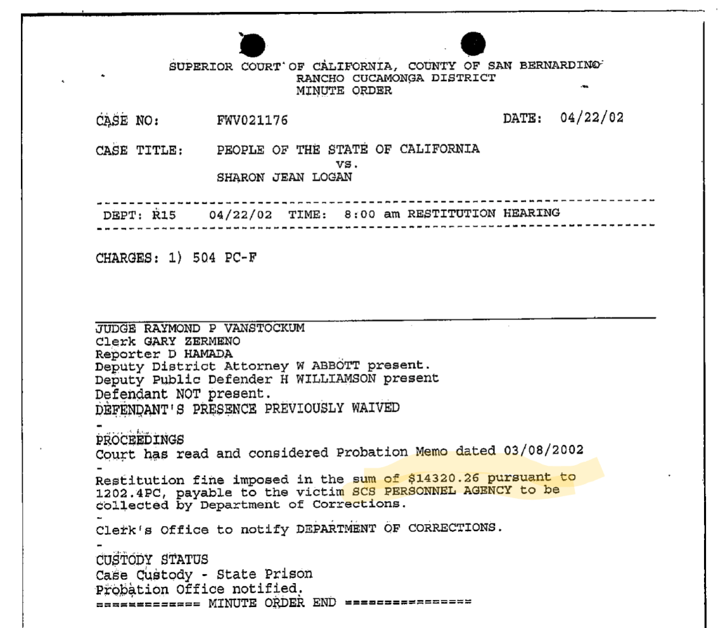 Logan was ordered to pay $14,320 in criminal restitution to the SCS Personnel Agency. As usual, we see no evidence she paid any of it. (If she had, we’d expect the file to say something about it, like it did after Logan was garnished in jail in 2017-2018 for restitution against the two plumbing companies she committed felony grand theft against when she worked for them.)