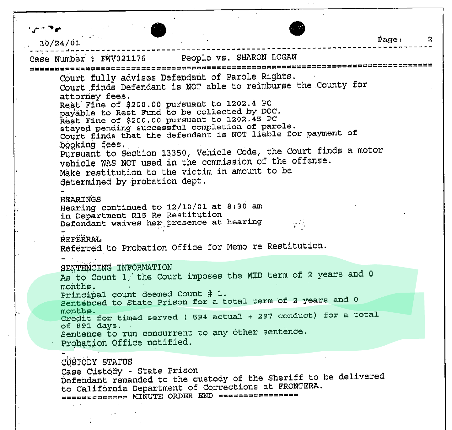 As you see below, Logan was sentenced to two years in prison on October 24, 2001, for this embezzlement. That’s minus 891 days she supposedly served while awaiting trial. (That may sound like a long time to be locked up pre-trial, but that’s because she was serving time for another crime.)