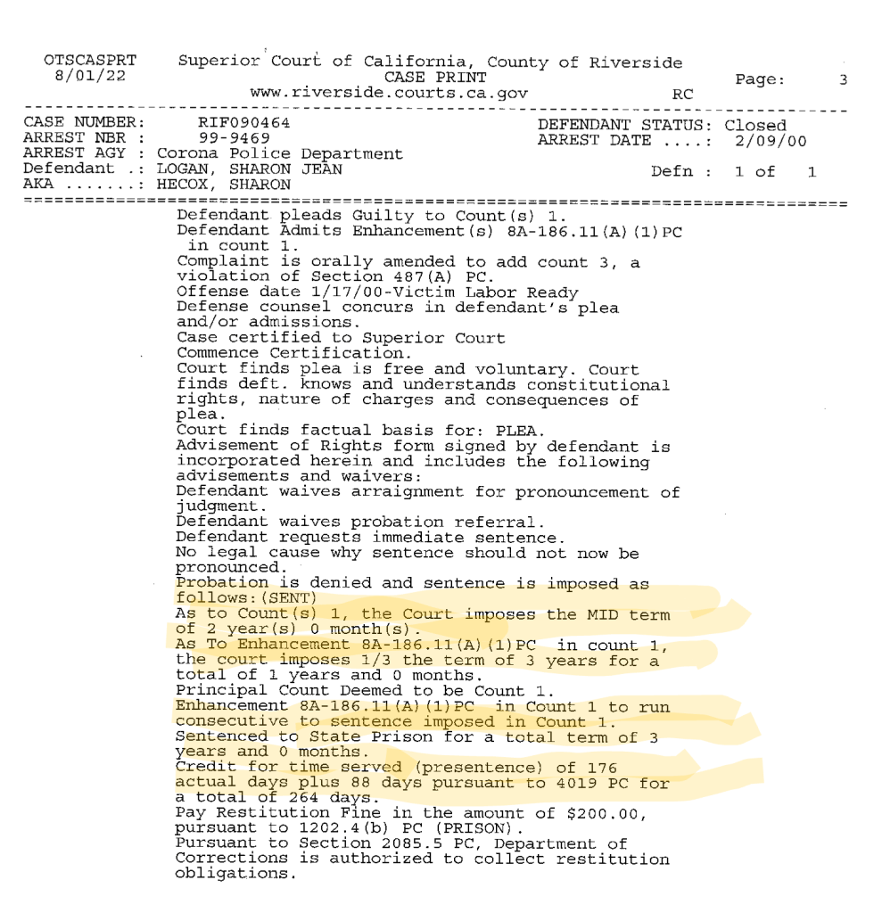 We’re only calling this Logan’s 6th financial felony because that’s the the order in which we found it. Timewise, it was Logan’s second financial felony, and her fourth financial crime overall, of a total nine money-related criminal convictions that we’ve found so far.