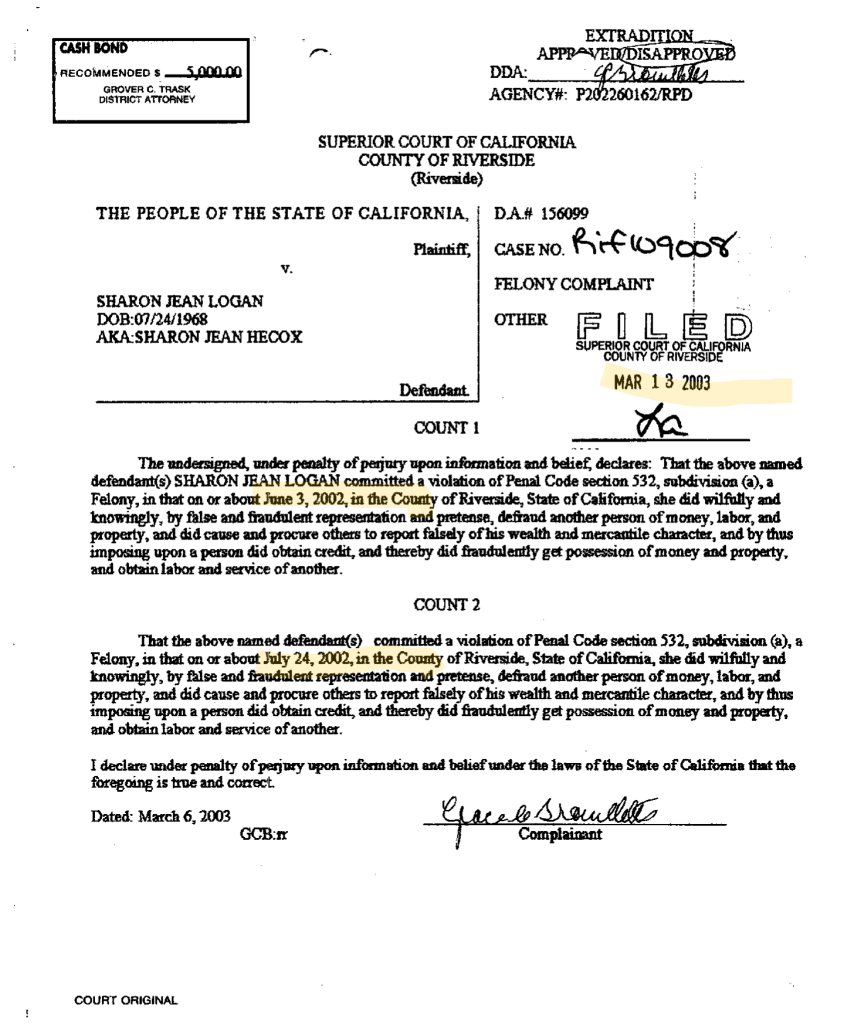 Now, don’t confuse this felony with Logan’s August 28, 2000 misdemeanor embezzlement conviction/felony theft conviction case in Riverside County for stealing $250,000 from Hanover Commercial Services/Best Temporary Services and Labor Ready. Or, with her two 2003 felony convictions in Riverside County for taking money by False Pretenses from Todd Breker.
