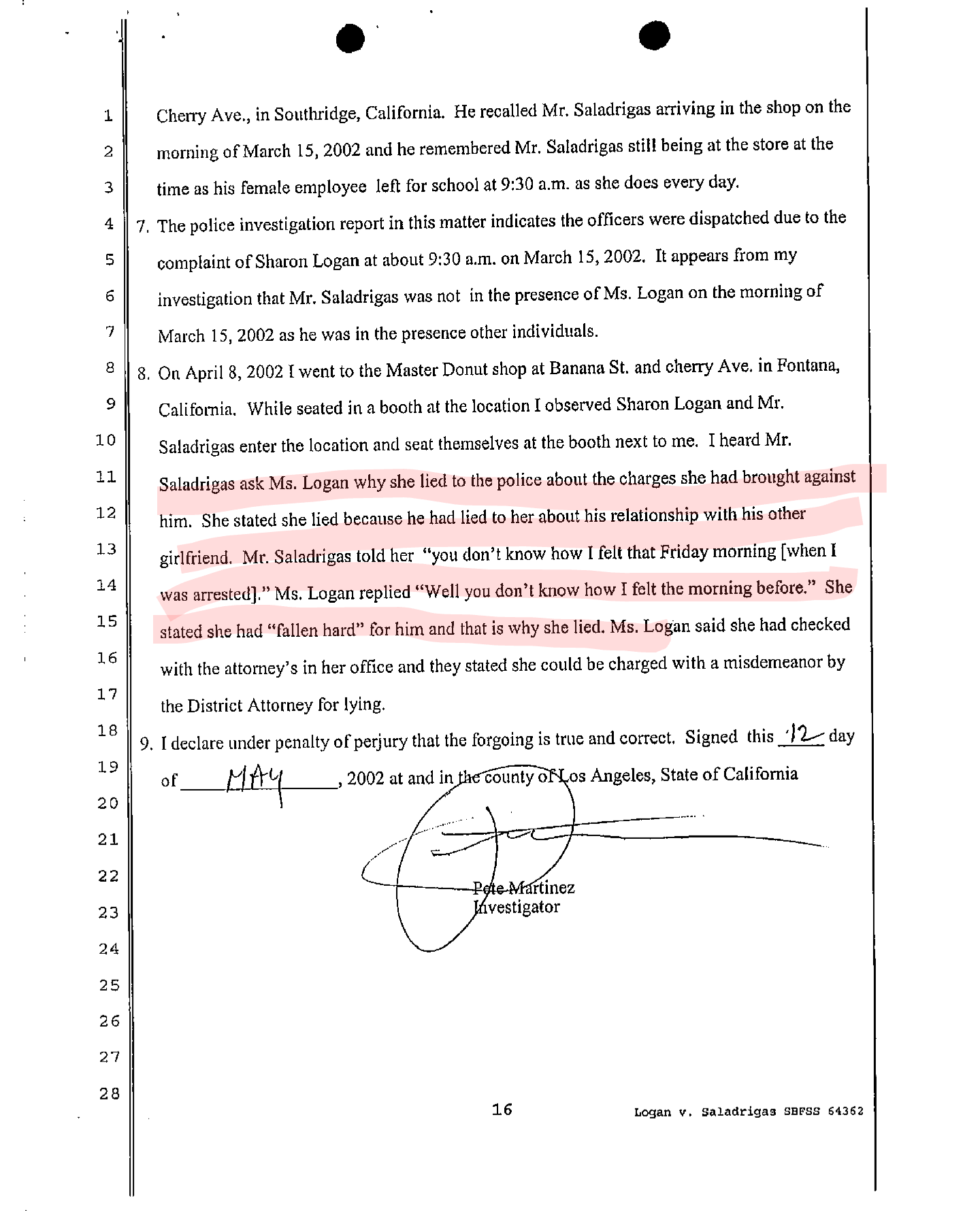 Salvador S tricked Logan into confessing in front of the PI by meeting her in a donut shop, according to the declaration. The PI sat nearby and overheard their conversation.