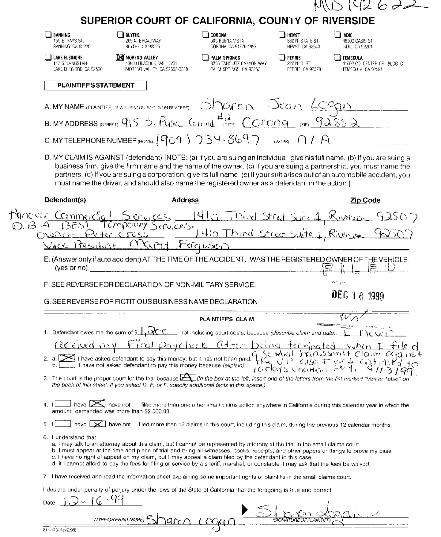 Turns out that in December, 1999, while Logan was on probation for ID Theft against her ex (MVA022916), while she was committing felony embezzlement from SCS Personnel in San Bernardino County (FWV021176), and three months before she would be criminally charged with grand theft, fraud, and embezzlement from Hanover Commercial Services and Labor Ready (RIF109008) for stealing at least $160,000 by falsifying time sheets, Logan accused her victim’s vice president of sexually harassing her.