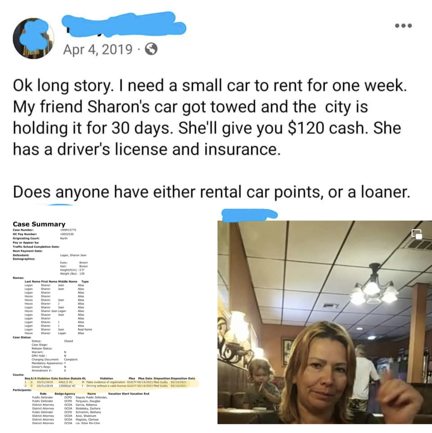 And, there is the fact that 6Time was on felony, supervised probation in Orange County until July, 2020. She was convicted of two felony grand thefts in 2017 for stealing from her employer. Shortly after she finished her jail sentence in early 2018, she moved into the unsuspecting Ms. G’s San Bernardino County house in Rancho Cucamonga. Logan’s probation required her to get the OC probation officer’s approval of where she lived, and her out-of-county address may have posed a problem.