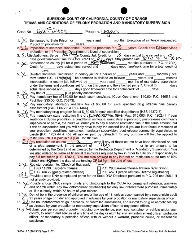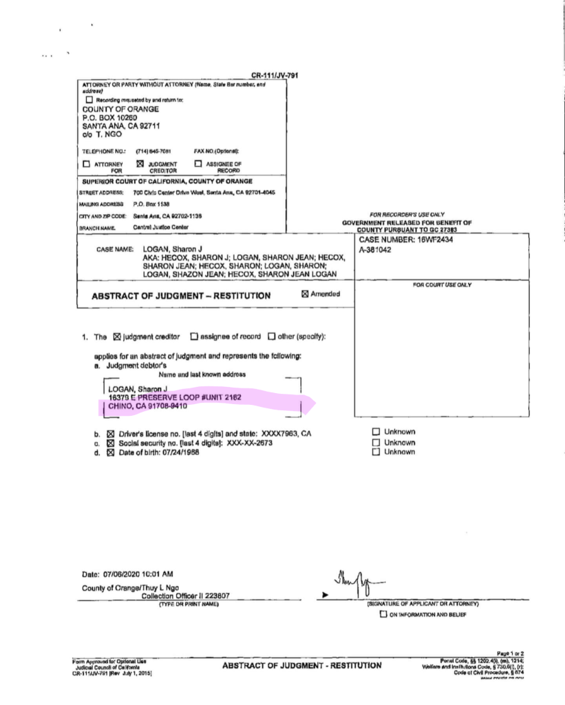 Where did the Orange County prosecutor’s office get that Chino address for Logan? As we noted before, Logan was on supervised probation until July, 2020 (three years after her plea was entered), and had to keep a probation officer informed of her current address. As another condition of probation, 90 days before it ended, she had to file her current address with the court so hrr victims could locate her for restitution payments. (Unfortunately, she’s still not paying.)