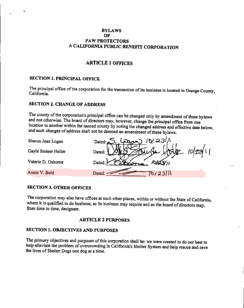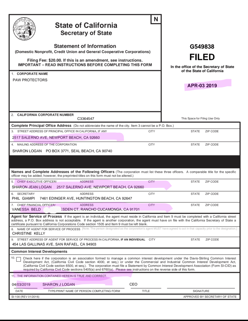 It probably won’t surprise many of you that Sharon Logan’s myriad deceptions extend to government documents, including her corporation forms for her nonprofit, Paw Protectors, Inc.