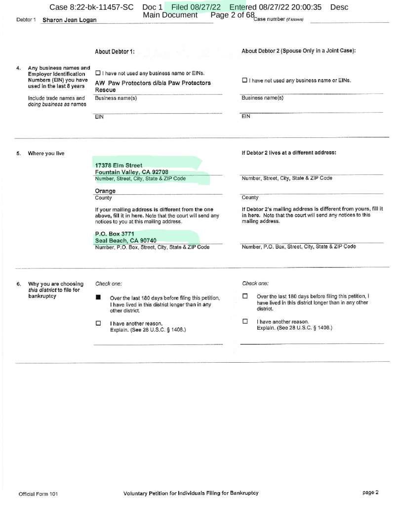 Contrast that with Logan’s August 2022 bankruptcy petition, signed under penalty of perjury, which does not list that Chino address as among her residences for the prior three years, which would have included July, 2020. It doesn’t list the Newport Beach address. It only lists Ms. G’s Rancho Cucamonga address, and the Fountain Valley address.