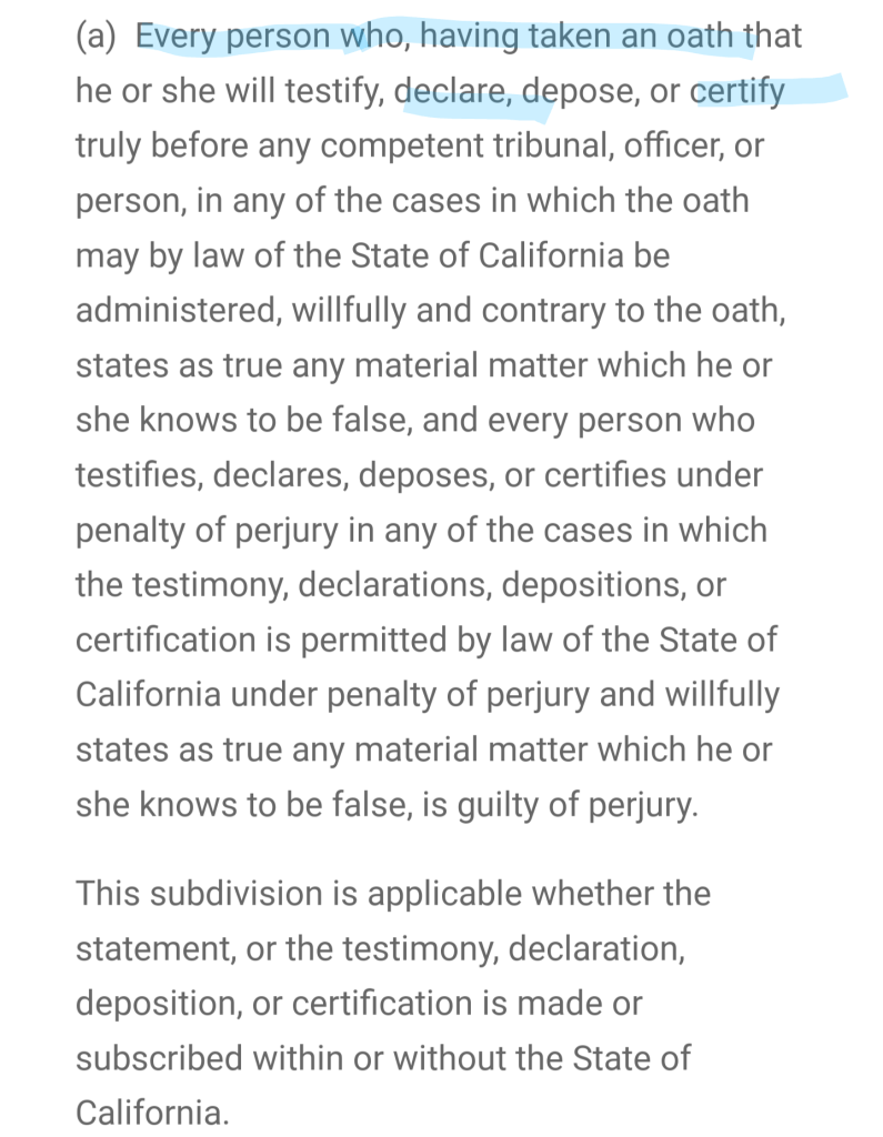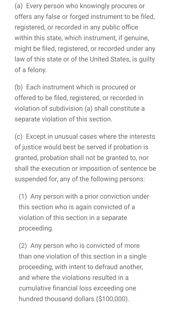 Alternatively, it’s a violation of California Penal Code section 115, regarding filing false government documents.