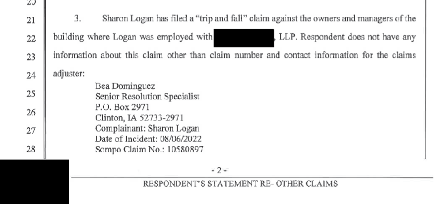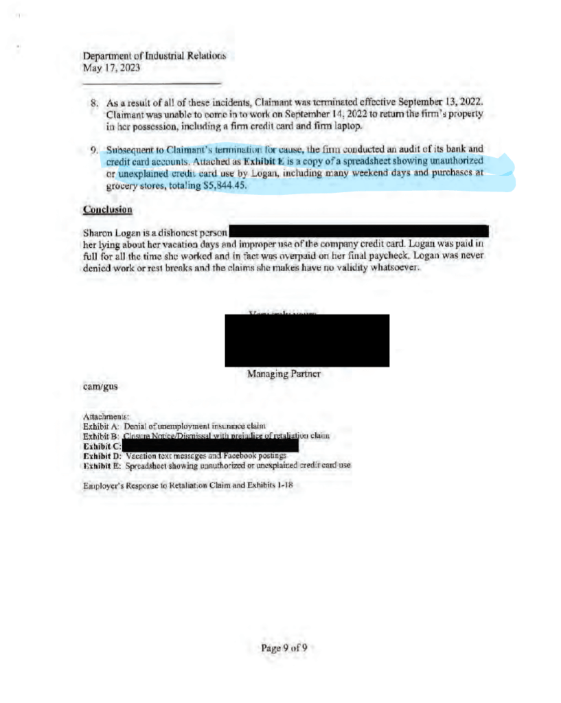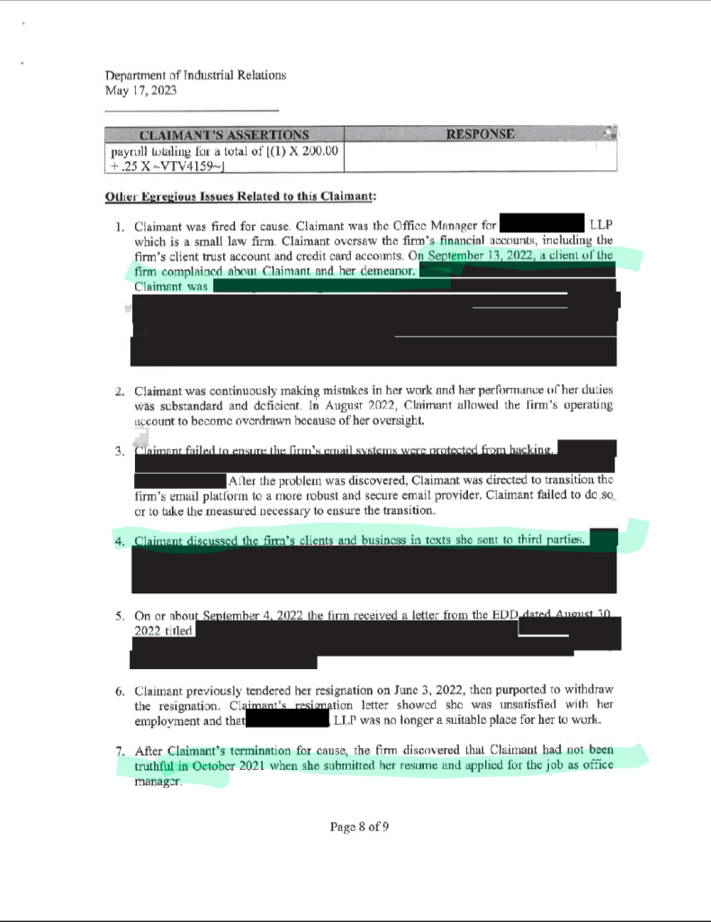 Shortly after her September, 2022 firing, Logan filed an unsuccessful claim with the labor board claiming she was fired from her office manager job not because of her undisputedly false resume (to which we had personally alerted the firm) ….
