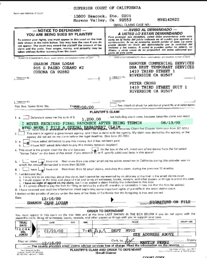 Logan also claimed “SEXUAL HARASMENT [sic]” and unpaid wages in an unsuccessful small claims case against another employer-victim in 1999, Hanover Commercial Services.